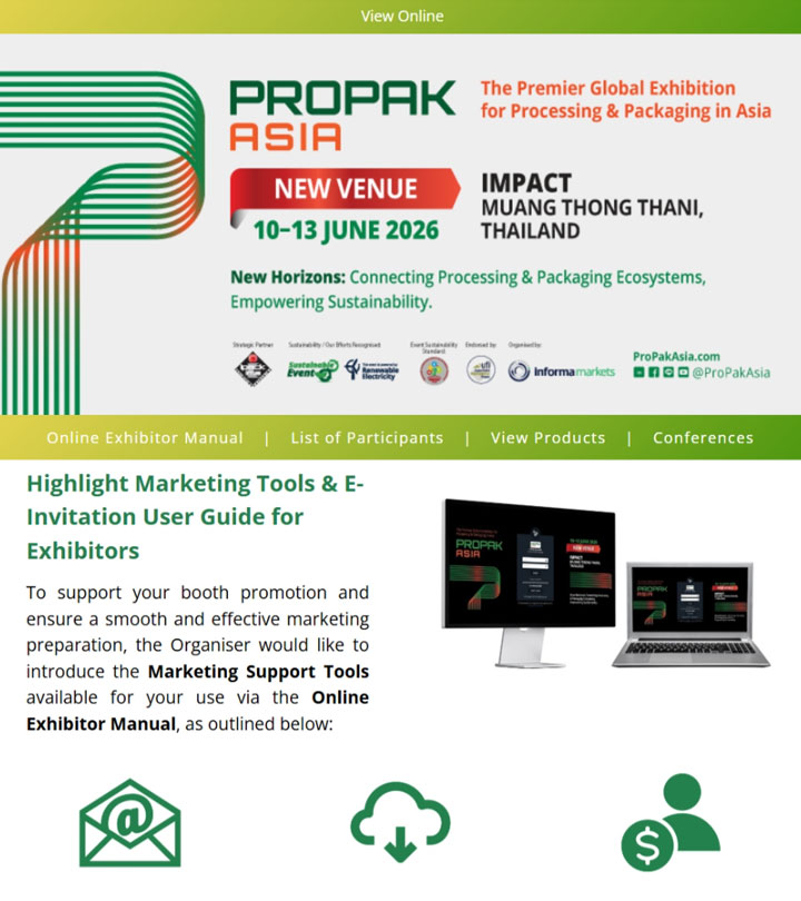 ขอเชิญเข้าร่วมงาน ProPak Asia 2026 ระหว่างวันที่ 10 - 13 มิถุนายนนี้ ที่อิมแพ็คเมืองทองธานี ชาเลนเจอร์ฮอลล์ 1 - 3